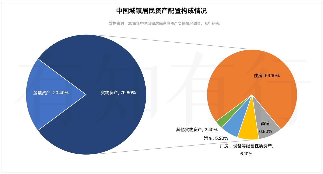 首先来看一下资产结构。2019 年底,城镇居民持有的总资产里,将近八成是实物资产,而金融资产只占到了两成。对于城镇居民来说,配置比例最高的资产还是房地产,住房和商铺的合计比例高达 66%,厂房设备占比为 6.1%,汽车资产占比为 5.2%。