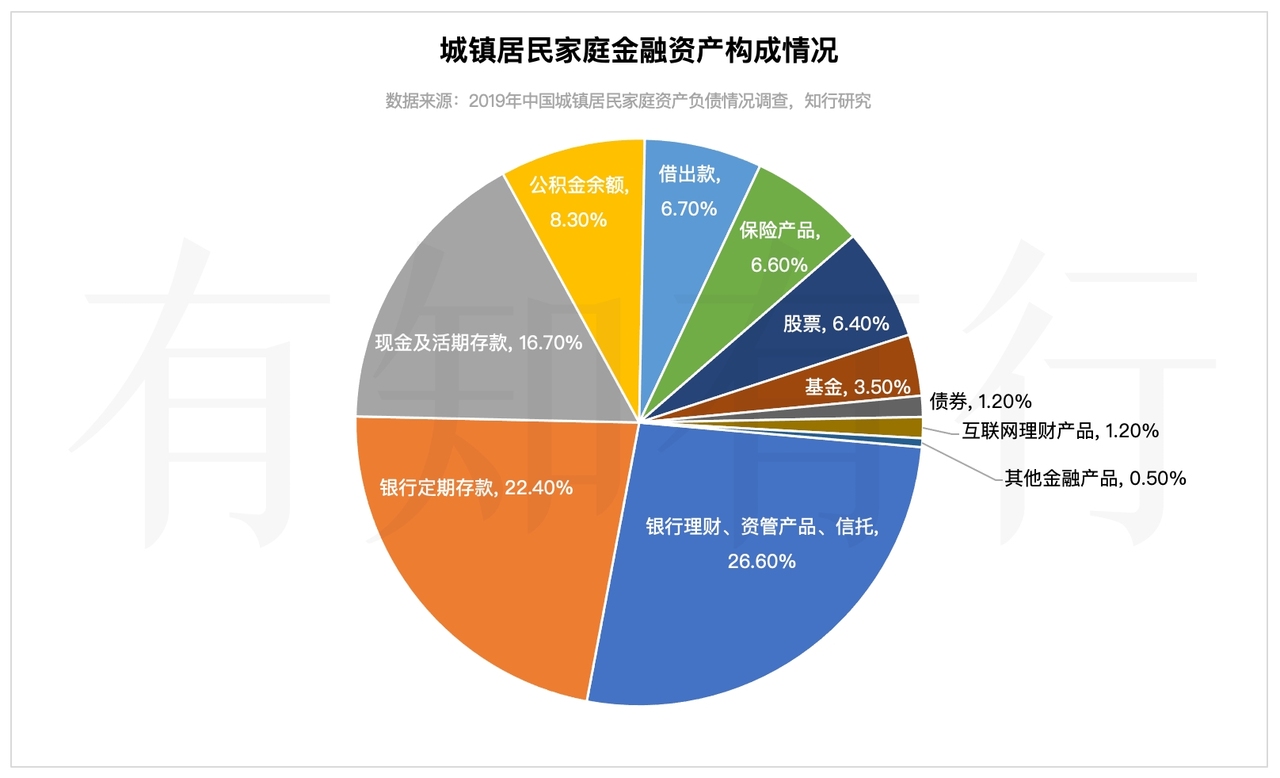 相对而言,居民配置的金融资产占比还是很低的。我们来细看一下金融资产的构成情况。从下图能看出来,在金融资产里,居民主要配置还是现金、存款、银行理财等低风险产品,对于股票、基金等风险资产的配置比例很低。主要原因是过去中国的无风险收益率很高,如果低风险产品的金融资产已经能够满足大家的收益率要求了,为什么还要去配置风险更高、收益还不确定的产品呢。