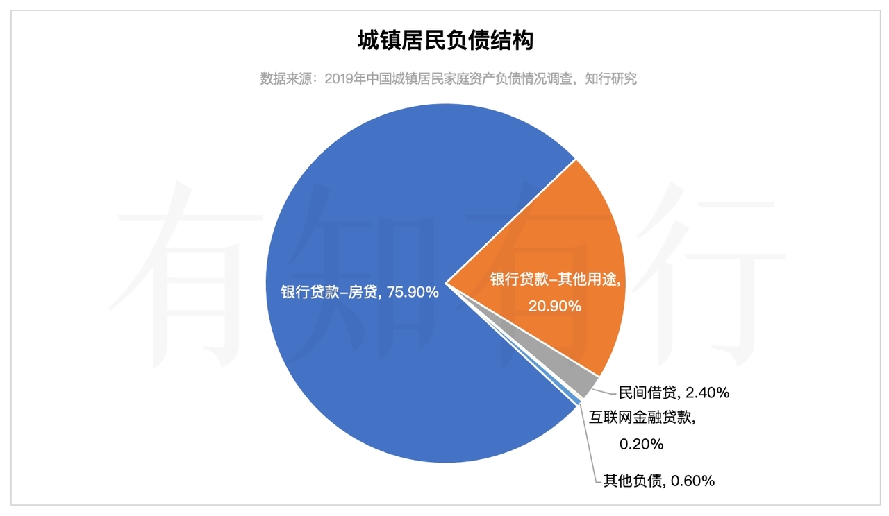 接下来,我们来看一下我国居民部门资产负债表的结构。由于这方面的数据统计难度很大,研究机构的测算差异也比较大,我们拿央行 2019 年的调查数据来看一下,作为城镇居民的资产、负债占比情况。