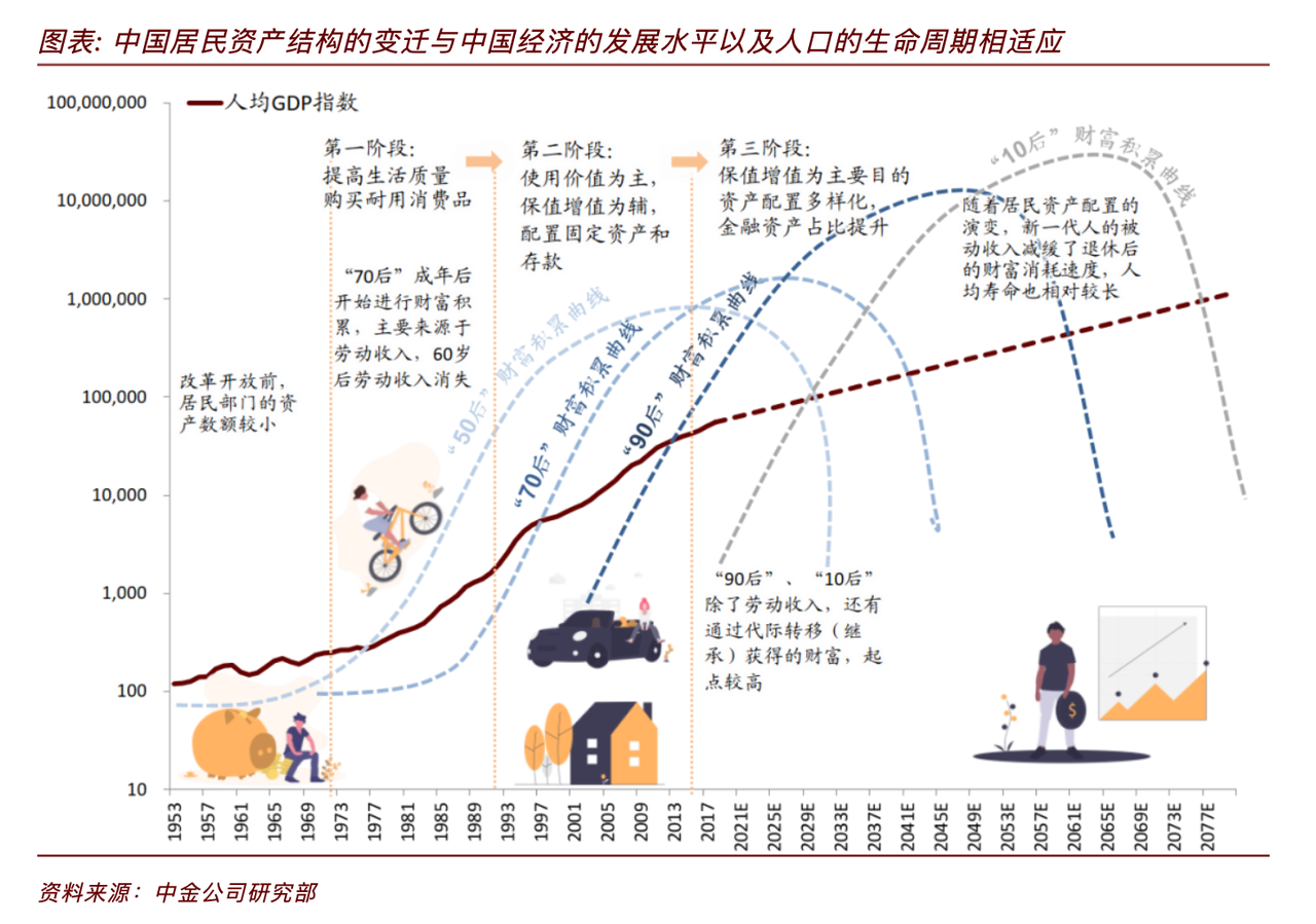 中金在 2020 年做过一个测算,展示了从 1953 年开始,中国居民资产结构的变迁,这种变迁与经济发展水平以及人口的生命周期相适应。例如,随着人们对于房子配置需求的降低,大家对于资产的保值增值的需求会得到提升,金融资产的配置比例将会得到提升,也就是图中的第三阶段。
