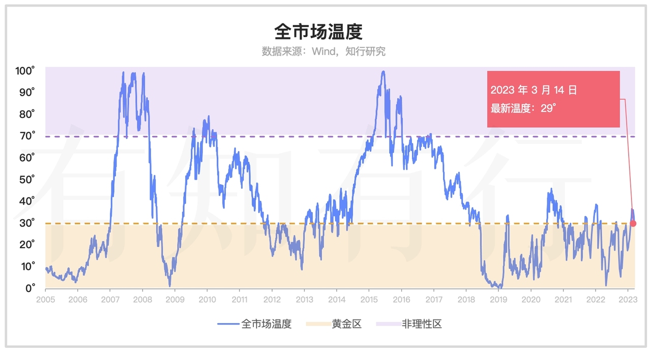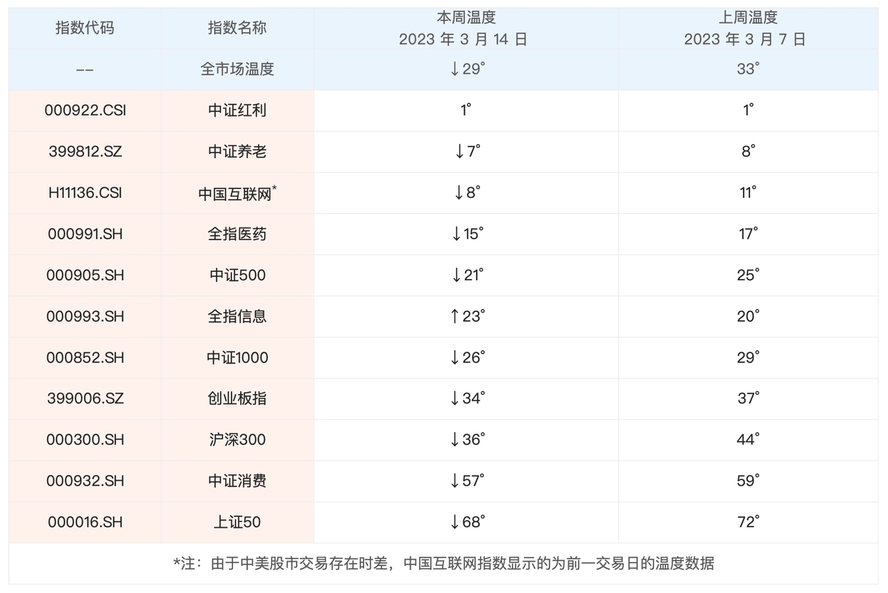 经过一周的市场调整,全市场温度来到了 29°,再次跌回了 30° 以下。具体指数温度方面,全指信息是唯一上涨的指数,上面说了通信、计算机、电子都是上涨的,全指信息上涨也是必然的。其它指数里,沪深300、创业板指温度下来得很快。创业板指今年的涨幅全部抹平,它的持仓里,电力设备及新能源占比最高,被拖累是必然的。