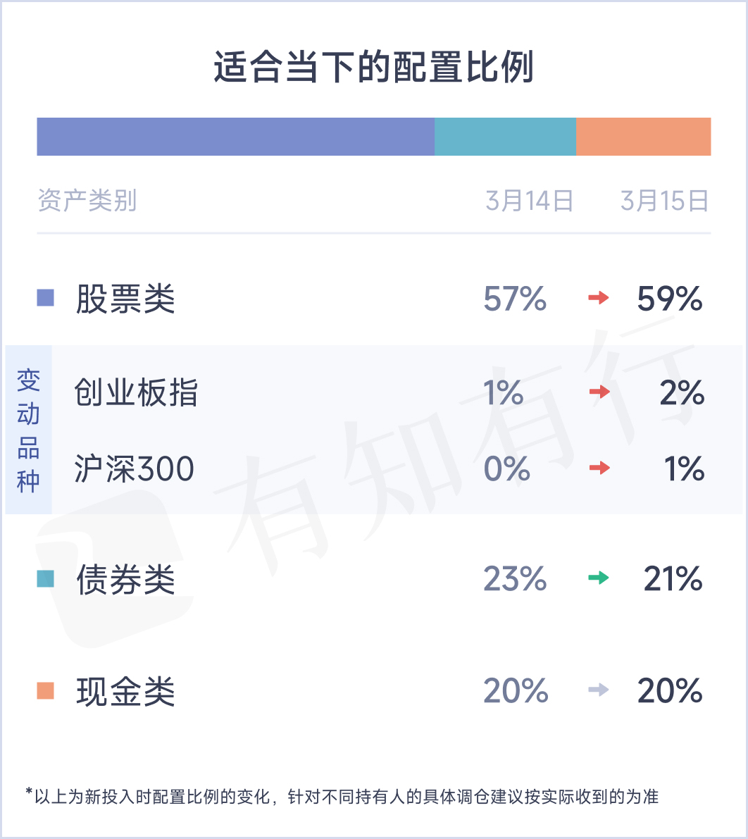 我们看到长钱账户本周也进行了调仓操作,调整了「适合当下的配置比例」,将股票类资产的比例从 57% 提高到了 59%,增加的仓位分别给了沪深300和创业板指。