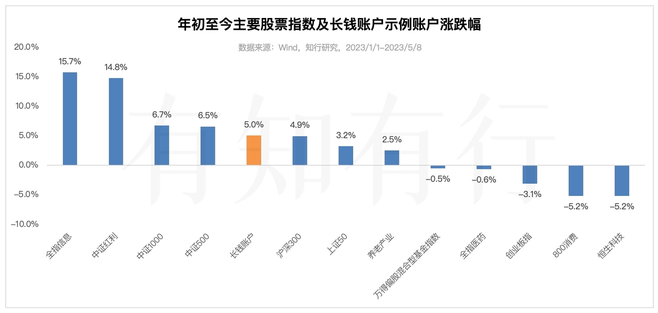 图中还展示了长钱账户示例账户今年以来的表现,今年上涨了 5%。不到七成的仓位获得这个业绩水平,还是可以的,越是极致分化的行情,分散投资的重要性就越凸显。