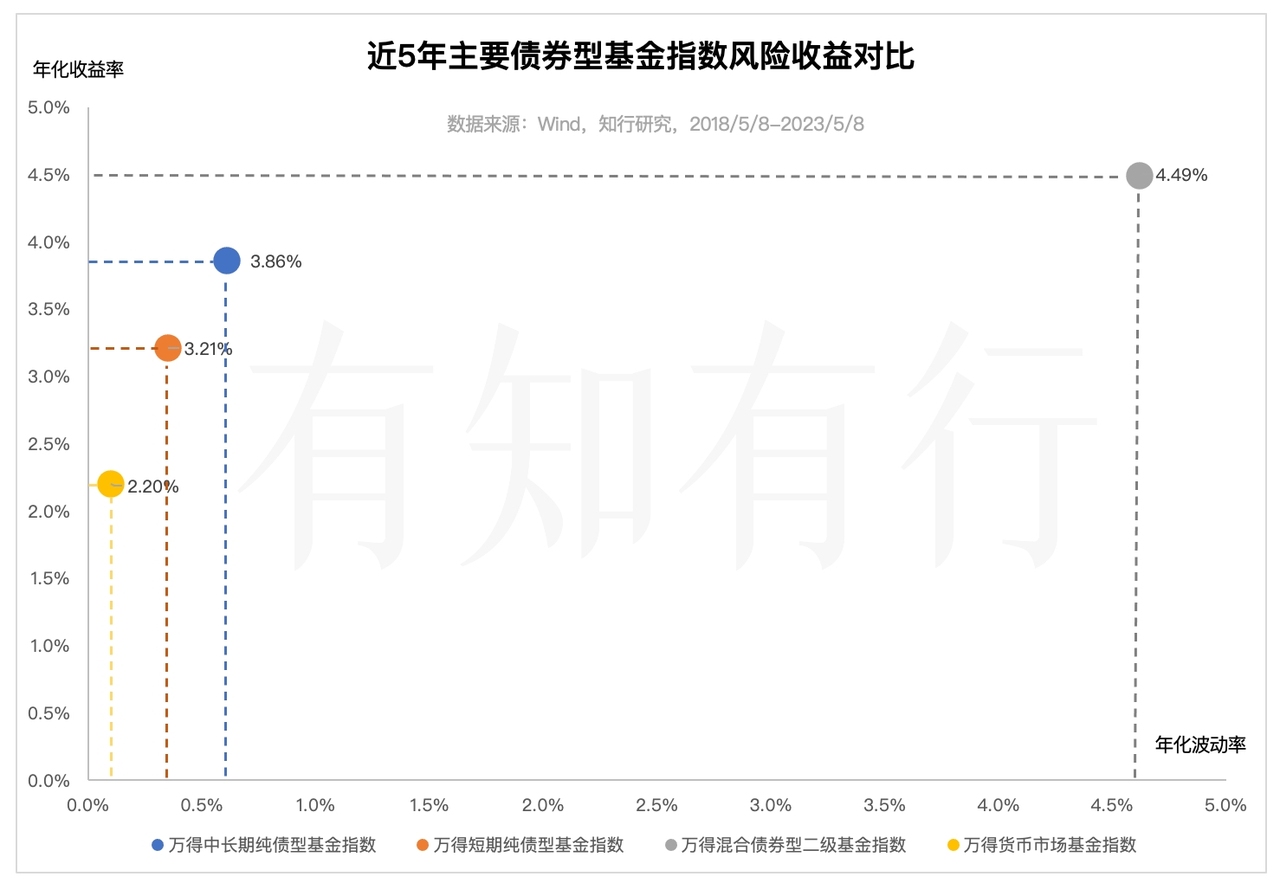 图里的统计时间是最近5年,统计对象分别是万得货币基金指数、万得短期纯债型基金指数、万得中长期纯债型基金指数、万得混合债券型二级基金指数。这四个是基金指数,反映了对应基金类型的平均水平。