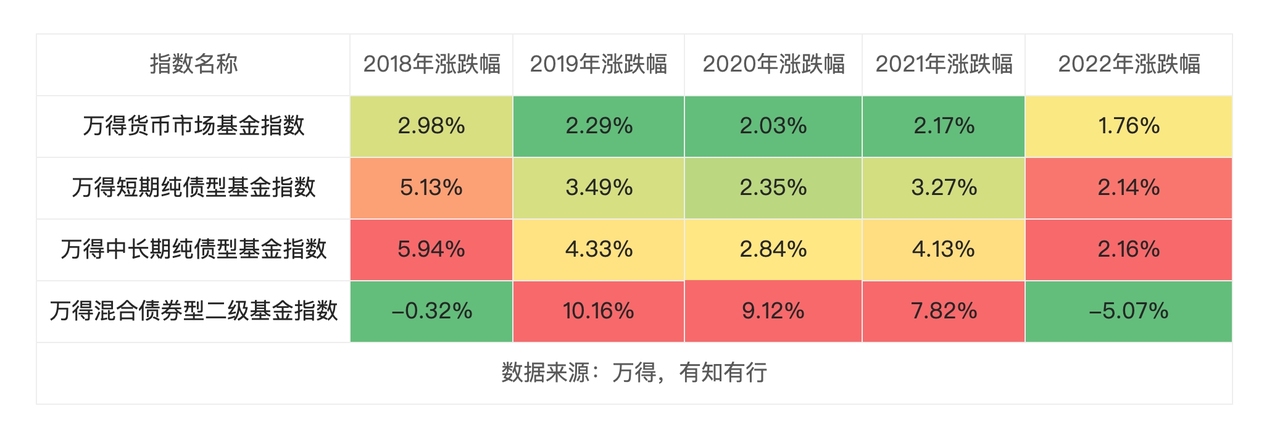 万得货币基金指数,反映了货币基金的平均表现;万得短期纯债型基金指数、万得中长期纯债型基金指数反映了短期纯债基金、中长期纯债基金的平均表现,这两类基金不投资股市,只投资债券,区别是后者投资的债券期限相对于前者更长,期限越长,承担的债市风险越大;万得混合债券型二级基金指数,代表了二级债基的平均表现,这类产品大部分投资债券资产,其余可以投资股票,但股票一般不高于基金资产的 20%。