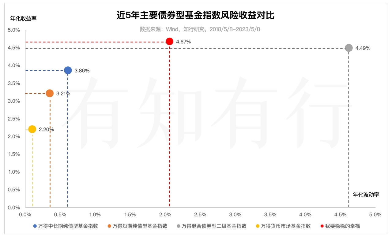 大家估计会问,上面说的都是单只基金,「我要稳稳的幸福」等投顾组合产品的风险收益特征是怎样呢?我们把「我要稳稳的幸福」最近 5 年的数据标注到图上。