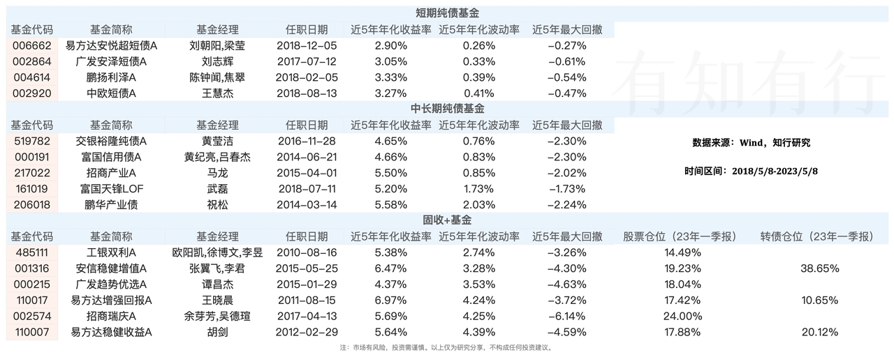最后,一定有用户说,想要单只基金的名单。我们在下面列了短债基金、长债基金、配置了少量股票仓位的「固收+」基金,这些是我们目前在研究的一些产品,都是主动基金指数基金挑选难度很小,就不列了。需要强调的是,列出这些基金产品只是跟大家分享我们目前的研究,并没有商业回报。大家经常跟我们说稳健理财的烦恼,之所以把这些写出来,应该是因为爱吧。