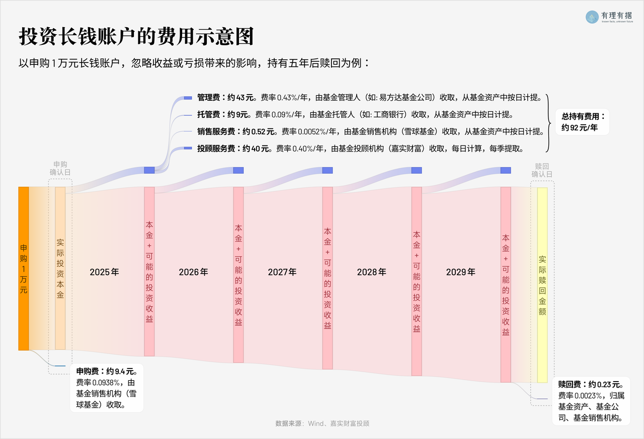 本文所述长钱账户费用及费率计算器,系为了帮助大家更好地理解投资相关的费用,仅作为示例测算,供参考。长钱账户具体费用以账户实际收取为准。