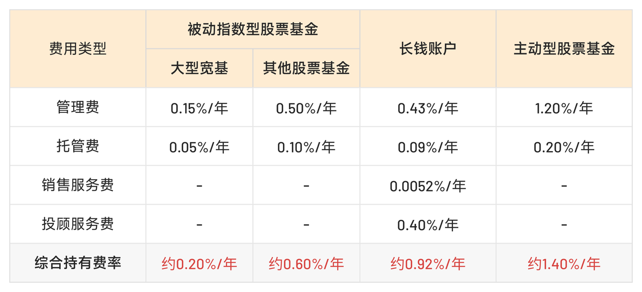 长钱账户费率贵不贵?👉 指数基金 < 长钱账户 < 主动基金