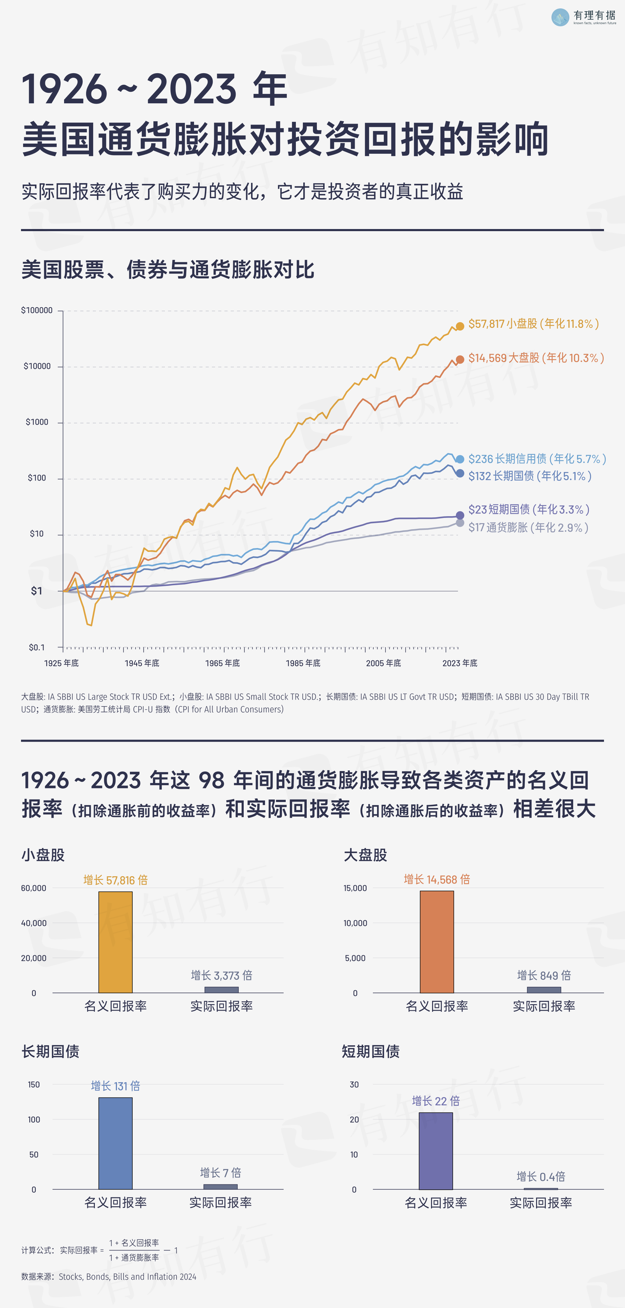 第二张图「1926~2023 年美国通货膨胀对投资的影响」中,我们看到短期国债的实际回报最低,经过 98 年它的实际回报只有 40% ,而长期国债的实际回报则有 8 倍左右。风险和收益相伴相生,下一期我们就以国债为例讲一讲无风险利率和债券期限溢价。