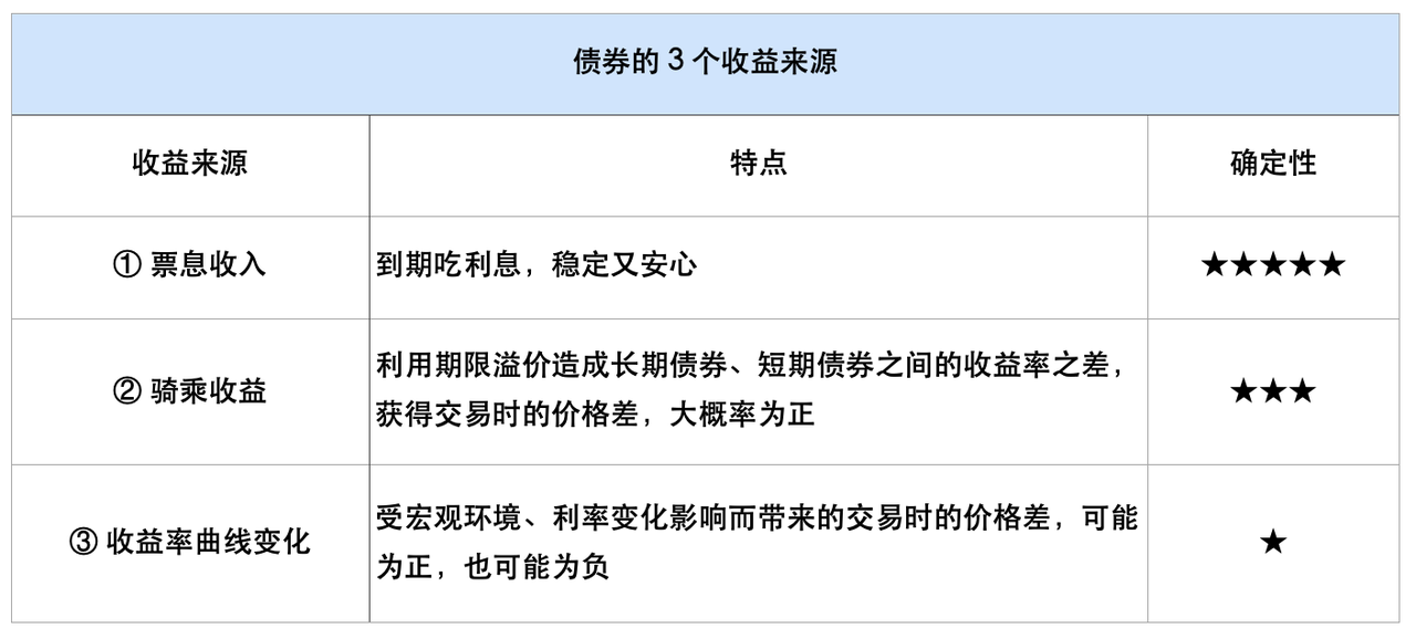 我们普通投资者很难准确预测宏观环境、利率变化,难以预测收益率曲线变化,无法稳定获得收益率曲线变化带来的收益,不妨把主要精力放在利息收入和骑乘收益上。