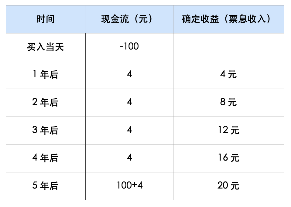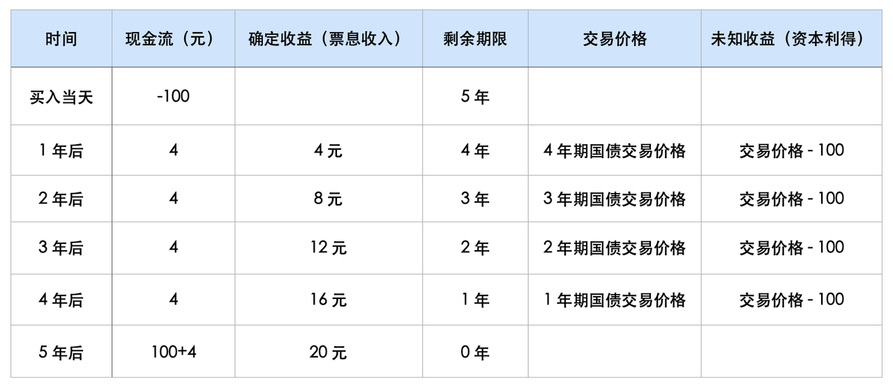 只要国债不违约,他就可以每年获得 100 x 4% = 4 元利息,持有 5 年总共可以获得 4 x 5 = 20 元利息。