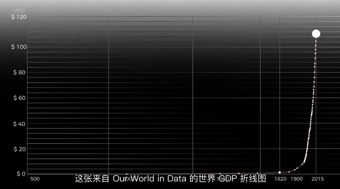 这张来自 Our World in Data 的世界 GDP 折线图告诉我们,很长一段时间,人类 GDP 接近一条横线,非常缓慢。直到 18 世纪,横线开始往上翘,几乎翘长了一条直线,而且目前似乎都没有停下来的趋势。
