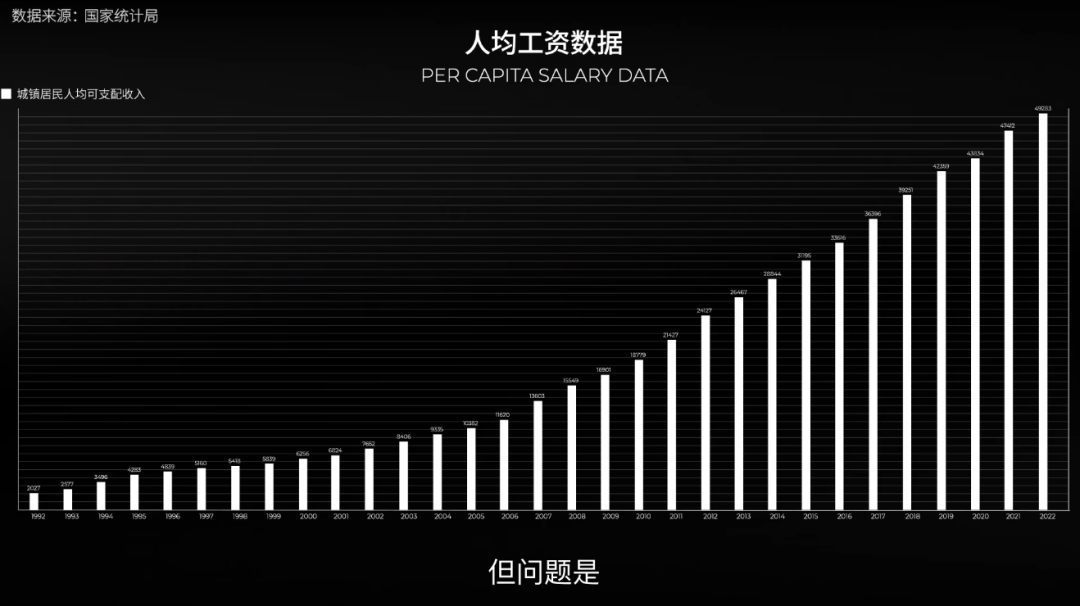 如果你的奶奶 1995 年在床底下放了 1 万块钱留给你未来买房子,2022 年的你会发现 1 万块钱好像连厕所都买不起了。我们可以根据国家统计局每年公布的人均工资数据,整理出一张这样的表,可以看到中国过去 30 年的平均工资变化。比如城镇居民人均可支配收入,从 1992 年的 2027 元增长到了 2022 年的 49283 元,大家赚的钱确实变多了,但问题是,花的钱也变多了。