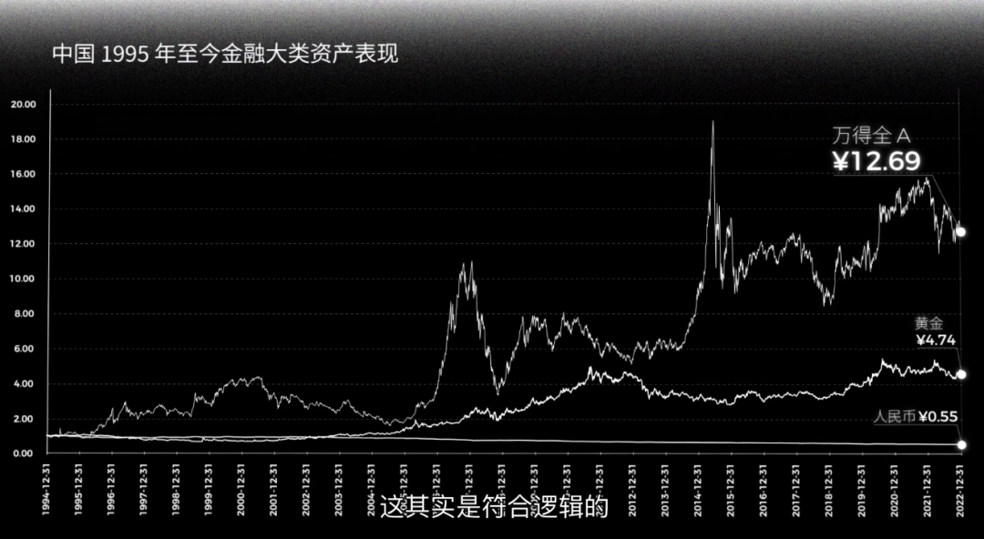 2002 年 12 月 31 日,万得全A收盘 960 点。二十年后,这个数字涨到了 4815 点,增长了五倍多,平均每年也有 8.28% 的年化收益率,并不低。如果把时间拉长到 1995 年,放到这张人民币购买力变化图里,会看到和其他国家类似的结果。