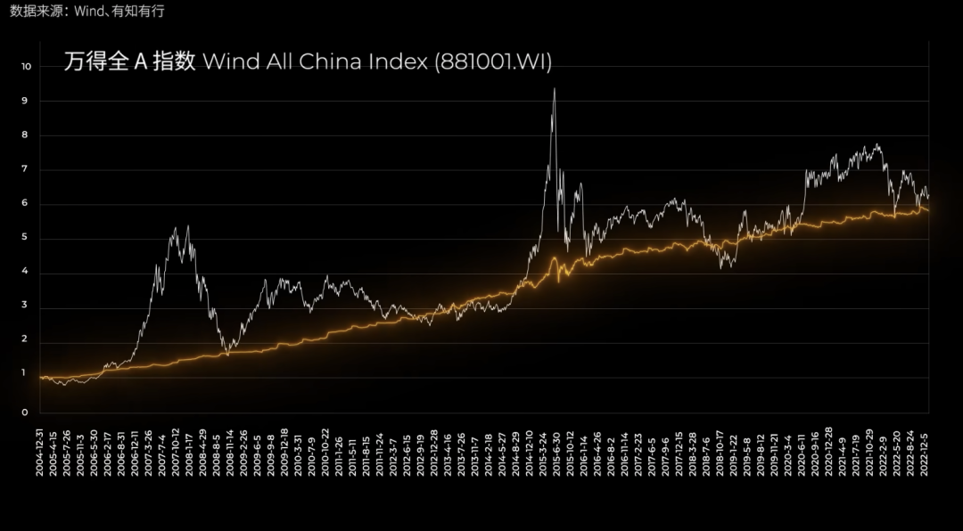 为什么是短期?如果把 20 年来A股所有公司的净资产曲线叠加在一起,你会发现这条线看起来非常稳定,几乎没有波动。