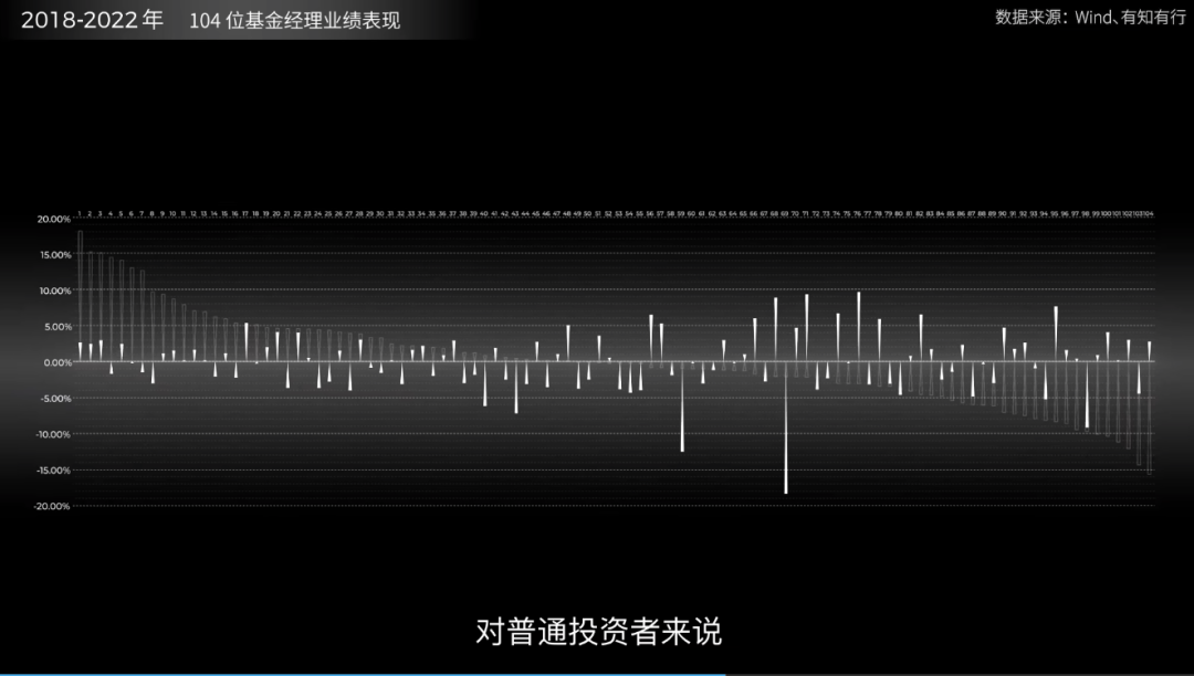 一个简单的实验可以告诉我们答案,我们选了 104 位来自中国各大机构的基金经理,在这张图里绘制出他们管理的基金在 2013~2017 年这五年的业绩表现。你可以把这根线看作是他们所有人这五年年化收益率的平均值。纵坐标是他们各自与平均值的差异,横坐标是差距排名。你可以想象,排名靠前的基金会如何宣传自己的投资策略和研究能力。在好成绩面前,这些看起来都非常可靠。