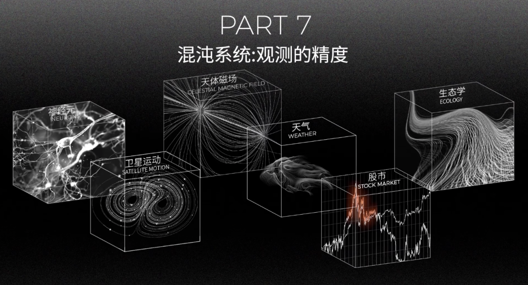 今天,我们可以在生活中发现各种各样的混沌系统,比如天气和股市。我们可以把 Xn 理解为此刻的天气,那么 a 就意味着变化率,成千上万个独立行为汇聚在一起,最终决定了天气的变化和走向。今天的人类已经可以准确预测探测器到达火星的时间,却还是无法准确预测明天的天气。这是因为天气和「Logistic映射」一样,对初始条件极端敏感。只有足够精确的信息观测,才能有足够精确的预测。而相比天气,股市还要更加复杂,因为我们的预测不会影响天气,但是会真实影响股市的走向。人心的加入让整个系统变得更加复杂,成为一个二阶混沌系统。