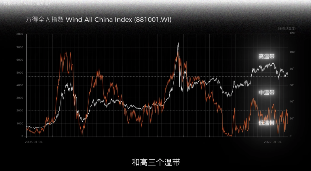 这张图是 2005~2022 年的万得全A指数,基于各种关于股票估值高低的指标,我们可以试图量化每一天的市场情绪,得到一条这样的线。就像温度一样,把市场情绪热度分成低、中和高三个温带。
