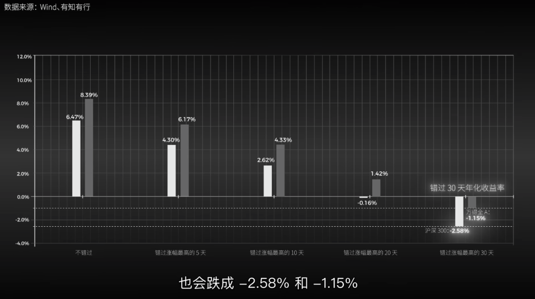 如果错过其中涨幅最大的五天,沪深300和万得全A的年化收益就会降低至 4.3% 和 6.17%。10 天、20 天,错过越多,回报越低。如果直接错过涨幅最高的 30 天,即使拿了 20 年,持有沪深300和万得全A的年化收益也会跌成 -2.58% 和 -1.15%。