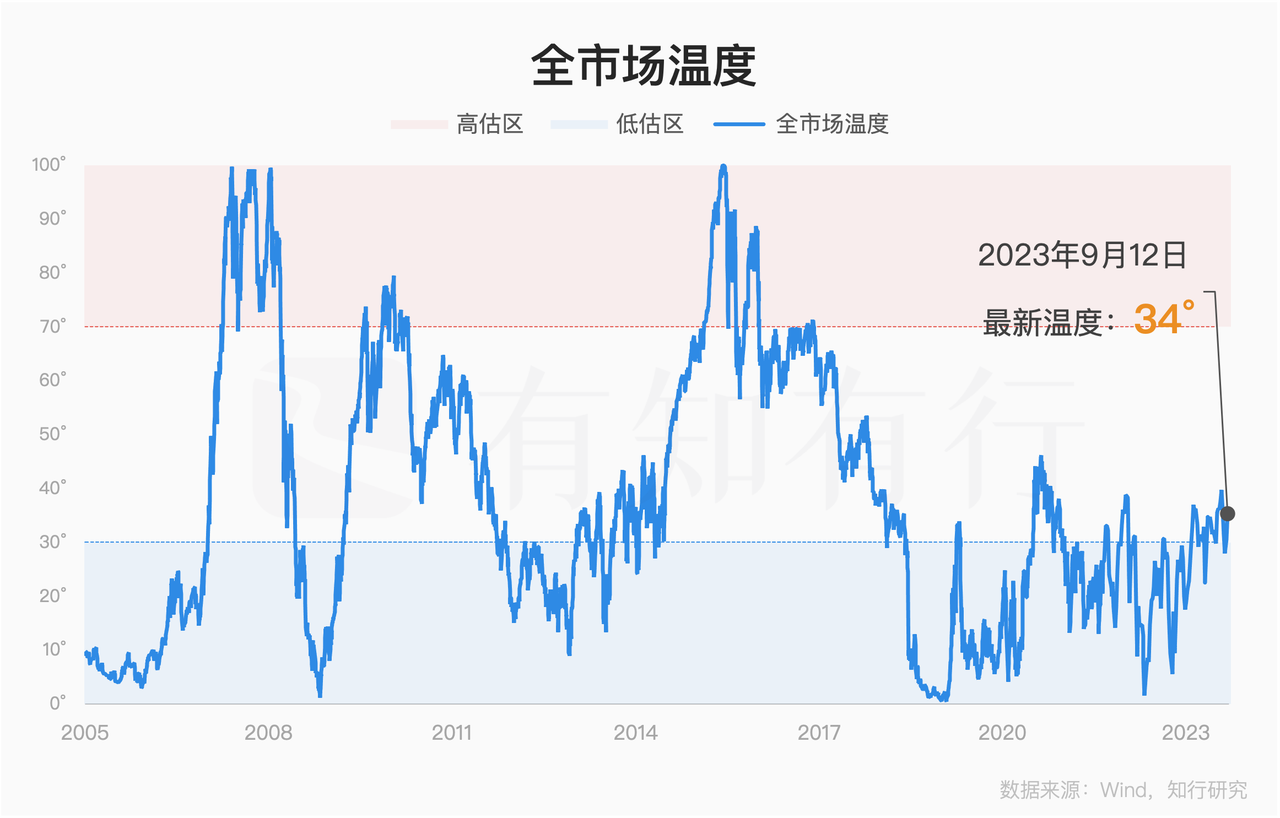 由于市场整体出现了下跌,最新的全市场温度是 34°,跟上周比,小幅下跌。具体指数里,恒生科技、创业板指跌幅比较高,温度下来得比较快。