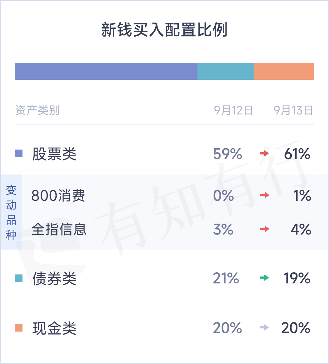 这次调整后,如果你有一笔新的资金要买入,会按照上面的配置比例进行分配。如果你之前就投资了长钱账户,当你整体持有的股票类资产的配置比例小于 61% 时,就会收到调仓信号,通知你卖出货币基金、买入相应的调仓品种。收不到调仓信号的也别着急,这意味着你的持仓是合适的,不需要进行调仓操作。