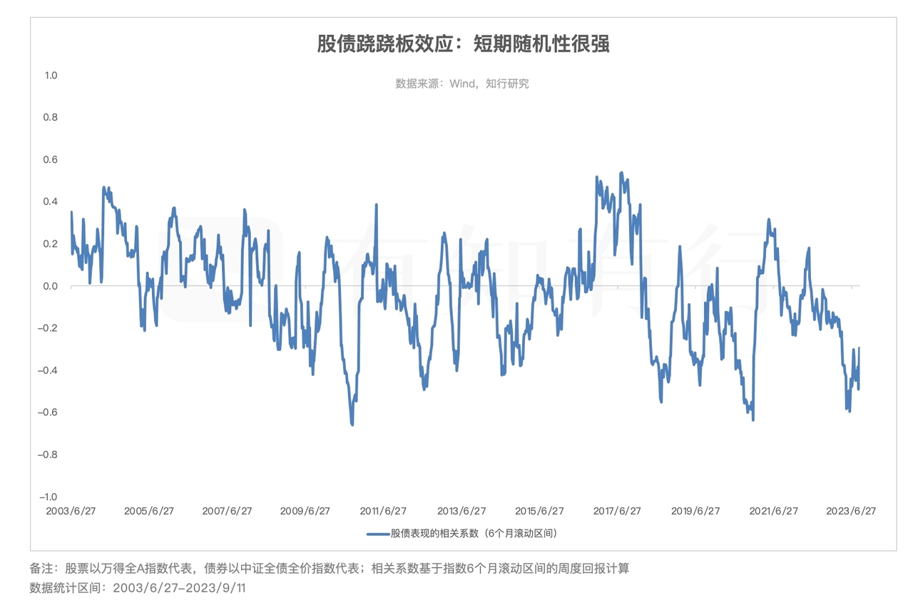 图上每个点的数据都代表了该点过去六个月股债的相关系数。从图里能看出来,从六个月的维度来说,相关系数在 0.6 到 -0.8 之间随机波动,有的时候是负相关,有的时候是正相关,有的时候不相关。这意味着,短期来看,股债跷跷板效应的随机性很强。今年股债跷跷板效应整体很明显,不意味着明年也这样。六个月都是如此,如果看更短的时间,随机性就更强了。