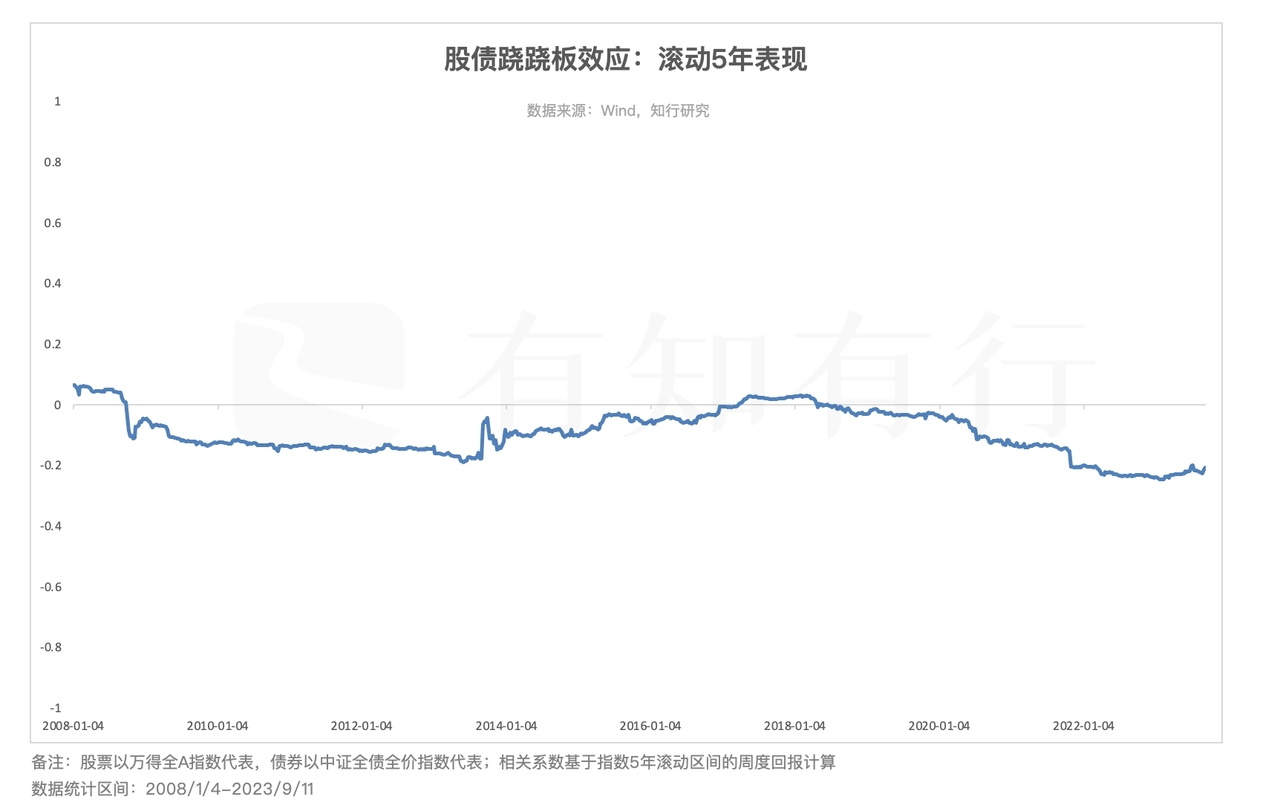 上面图里,我们用万得全A指数代表股票表现,用中证全债全价指数作为债券的表现,计算了二者的相关系数。在计算周期上,我们选择了过去六个月的滚动区间。什么意思呢?最新数据是 2023 年 9 月 11 日,相关系数是 -0.31,这意味着站在 9 月 11 日,看过去六个月股债之间的相关性。-0.31 意味着是股债在过去六个月是负相关的,也就是存在股债跷跷板效应。