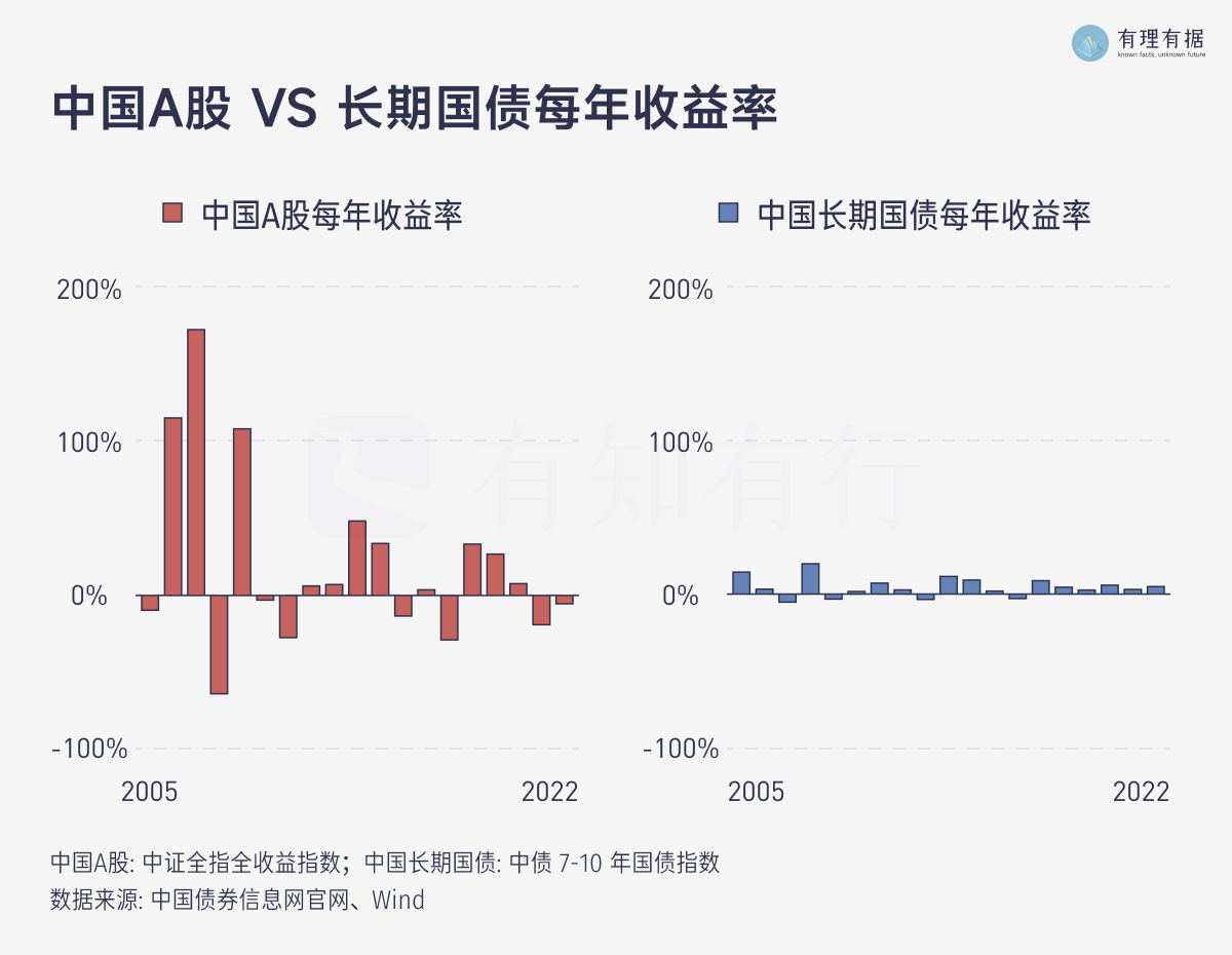 投资中,一般用「年化波动率」衡量投资标的的波动风险,代表每年的收益率偏离平均收益率的程度。过去 19 年,中国长期国债的年化波动率是 6.33%,而A股的年化波动率为 56.33%,A股的波动是长期国债的 9 倍左右。如此大的波动,也显示了投资A股的风险比投资长期国债大得多。