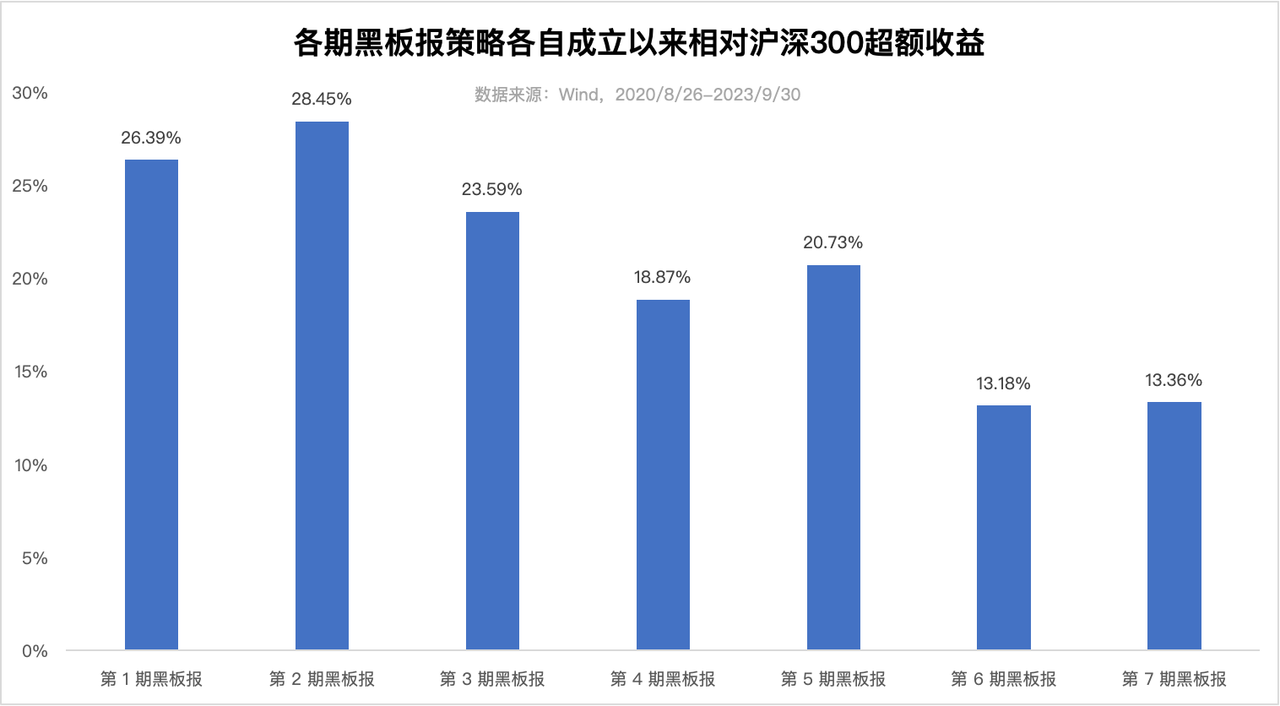 与之对比,沪深300在今年前三季度下跌了 4.70%,第 1-7 期黑板报业绩全部跑赢沪深300。