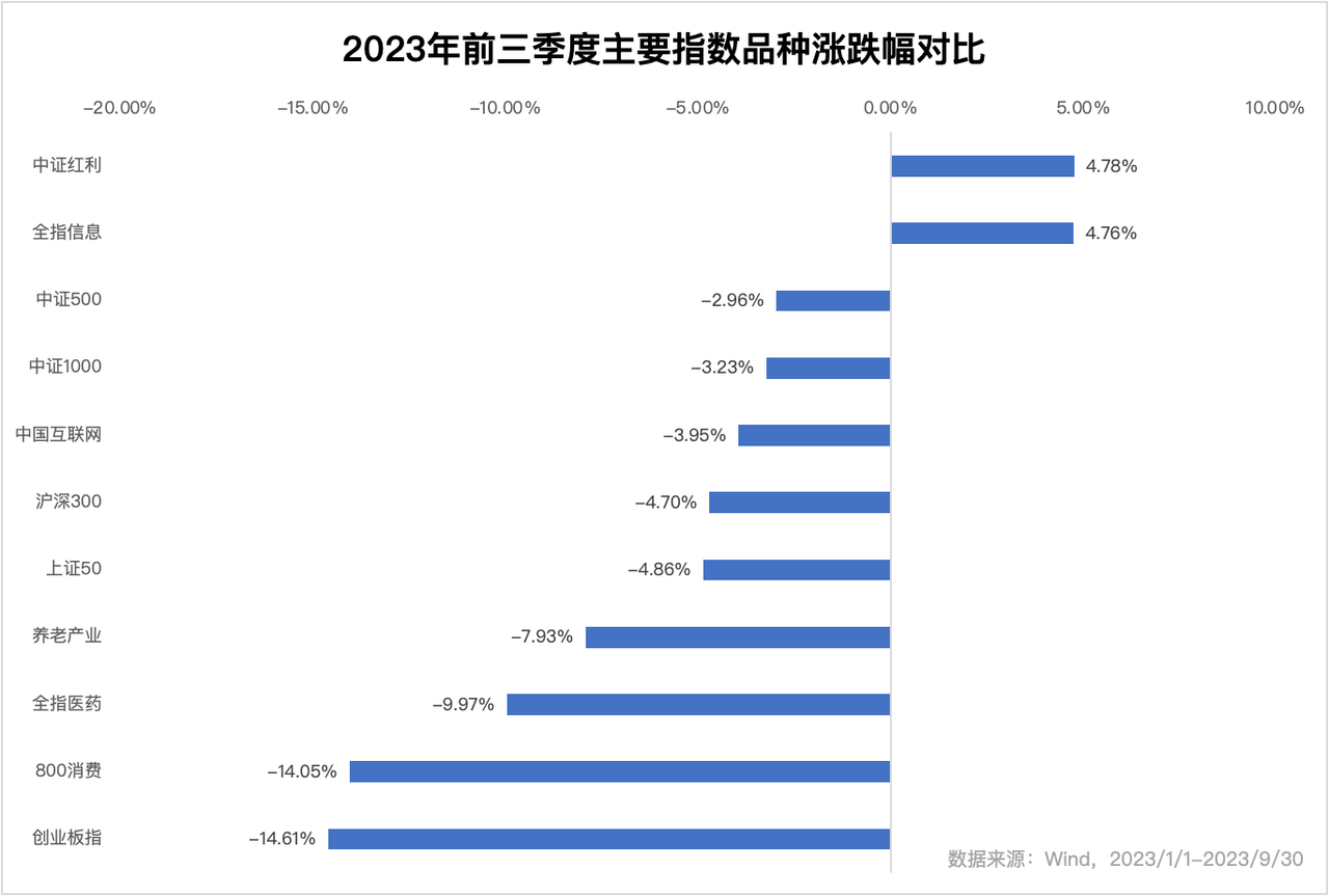 从 2021 年初至今,以沪深300为代表的宽基指数已经经历了几乎连续三年的下跌,沪深300在 2021 年下跌了 5.20%,2022 年下跌了 21.63%,2023 年前三季度下跌 4.70%。如果看这期间的最大回撤情况,数据会更差。沪深300从 2021 年 2 月 10 日的阶段高点,到 2022 年 10 月 31 日的阶段低点,回撤了 39.59%。过去的三年,对于绝大部分的A股投资者来说,面临的都是一轮不尽如人意的熊市行情。