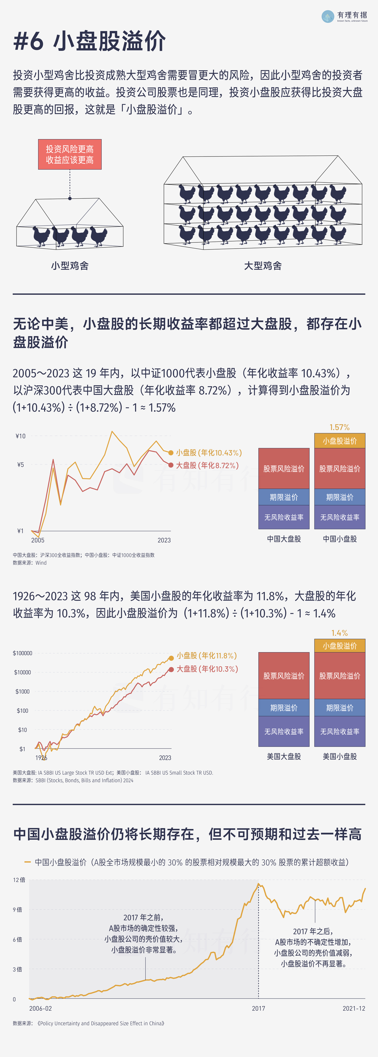 好清晰❤️!在美国,大盘股溢价等于股票整体股权溢价;在中国,大盘股溢价低于股票整体股权溢价。但不管中美,小盘股相对大盘股都有更高回报。 在美国,小盘股相对大盘股的溢价相对稳定 —— 补充栋大的指正:在美国小盘股溢价也不是持续稳定,也会有些年有、有些年没有,只是长期下来会表现出来小盘股溢价; 相比美股,A股的小盘股溢价更大、波动也更大、在2017年前后有个分界(和A股借壳上市的特点有关,学到了)。—— 也补充栋大的指正:图里红线一直比黑线高,只能说明从起点开始的累计超额收益一直是正的,但投资不都是从2006年底开始,可能从中间任何一个点开始。比如从2017年开始,红线就不会一直比黑线高了。 *以上都是从历史数据上看,未来无人知晓。 对小盘股和微盘股的不同分类也学到啦,记个结论:2024 年之前用沪深300代表大盘股,中证1000代表小盘股;2024 年之后,中证800代表大盘股,中证2000代表小盘股。 @和有知有行一起玩耍的第 1213 天
