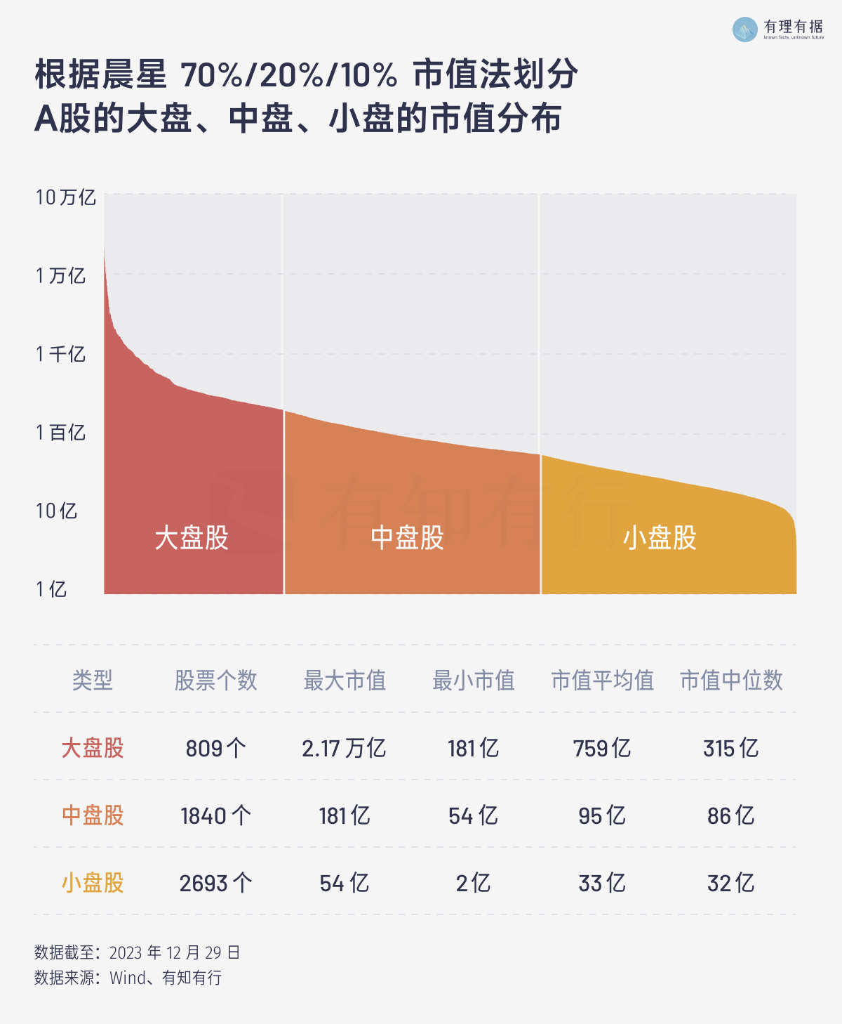按照晨星的计算方式,A股的大中小盘股票的市值分布大概是这样的: