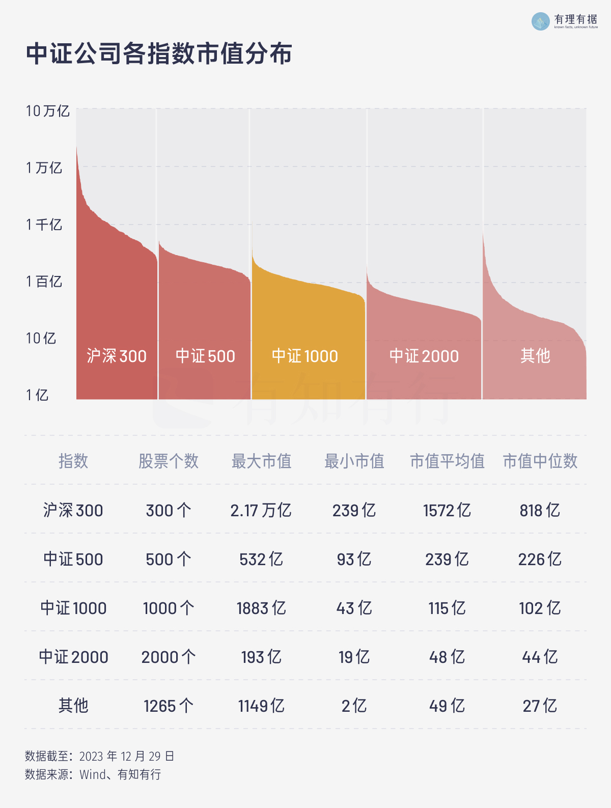 「中证1000」市值占比 13%,市值中位数大约 102 亿,和晨星中盘股 86 亿接近,更适合作为中盘股的代表;