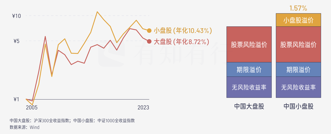 在 2005 ~2023 这 19 年里,中国的小盘股风险溢价为 (1 + 10.43%) / (1 + 8.72%) - 1 = 1.57%。