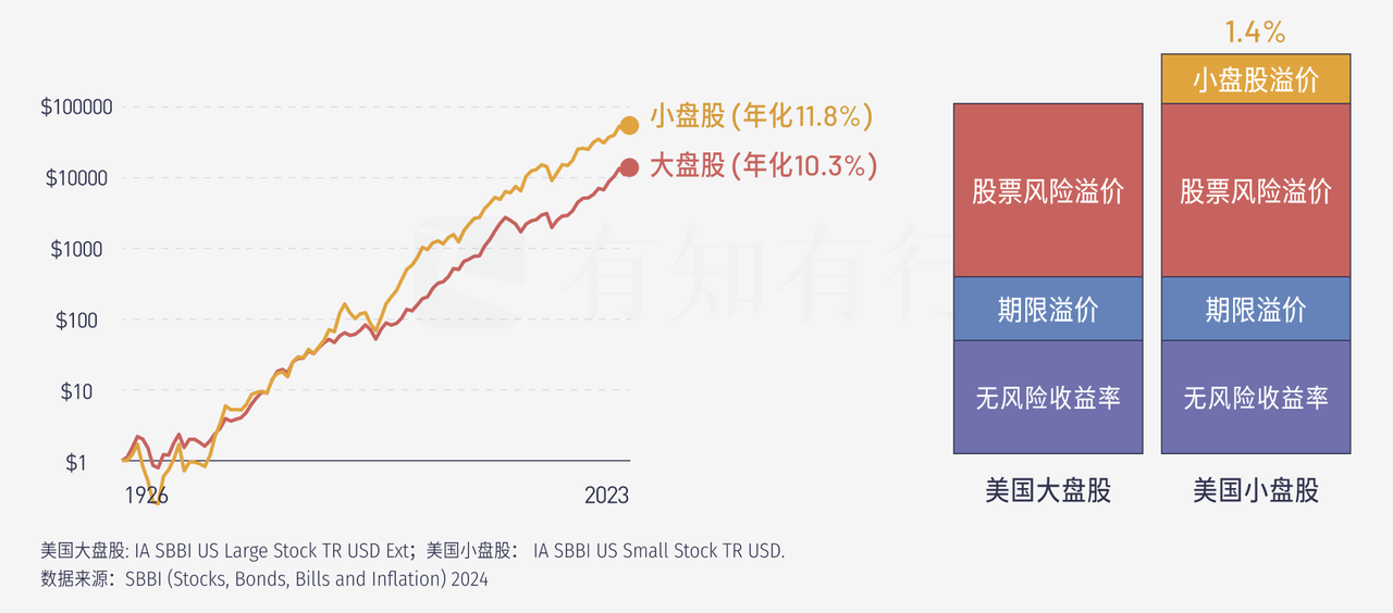 从 1926 ~ 2023 这 98 年中,根据 SBBI 数据,美国的小盘股风险溢价为 (1 + 11.8%) / (1 + 10.3%) - 1 =1.4%。
