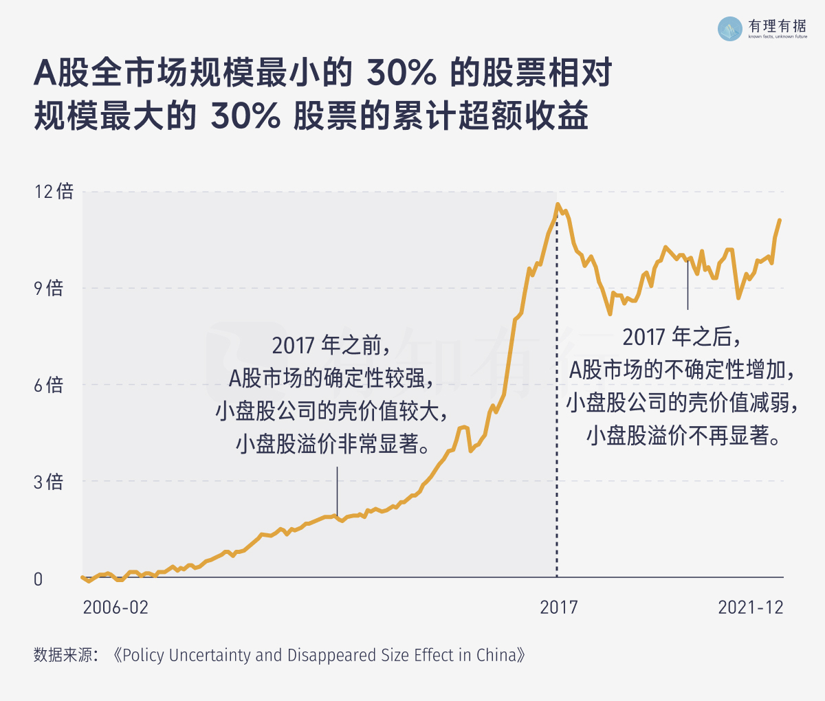 这是因为,2017 年之前,A股市场的确定性较强,投资者更愿意承担风险来获得更高收益,因此倾向于投资小盘股。另外,A股小盘股的「壳价值」也吸引投资者在小盘股投资上投机氛围更强。