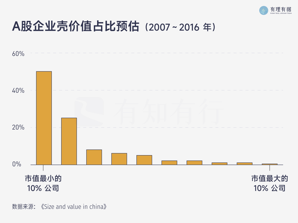 从图中我们可以看出,小盘股中壳价值的比例非常惊人,而在大盘股中,壳价值则非常小。在市值最大的 10% 的股票中,壳价值几乎为 0 。也就是说,A股小盘股溢价中,有一个很重要的收益来源就是壳价值。