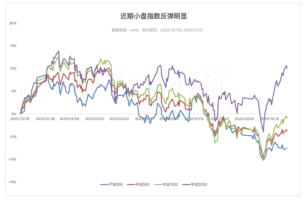 上图显示了不同规模指数今年以来的表现,从图里很明显能看出来,今年以来,市值规模越小的指数表现越好。中证2000在十月底的反弹中,上涨最为明显,整体已经回到了八月初下跌前的指数水平。而沪深300相对来说,表现最弱,尽管十月底以来也有所反弹,但反弹力度很小。