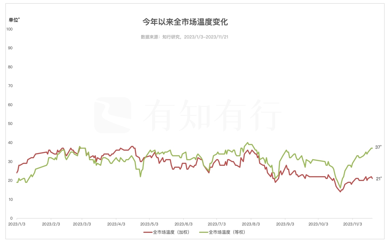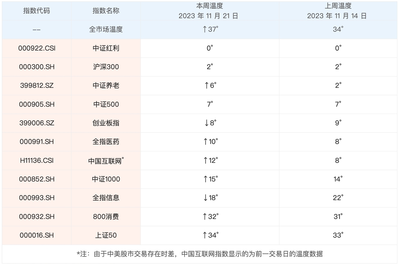 由于近期大量的小盘股整体表现好于少量的大盘股,全市场温度(等权)的提升幅度大于全市场温度(加权)。最新的等权温度是 37°,最新的加权温度只有 21°。大小盘的短期分化使得两种计算方式的温度也出现了分化。