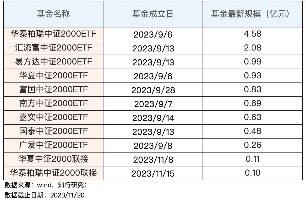 实际上,公募基金目前布局的市值规模最小的指数产品就是中证2000。中证2000指数基金还是今年九月份之后陆续成立的,目前有 9 只ETF、2 只ETF联接基金。这 11 只基金最新合计规模只有 11.68 亿,整体规模太小了,有的基金成立时规模不小,经历了两个月的运作,规模大幅度缩水。作为我们可投资的场外基金,规模就更小了,两只场外基金规模只有 1000 万左右。总之,这个品种对应的基金还需要进一步的发展和验证。