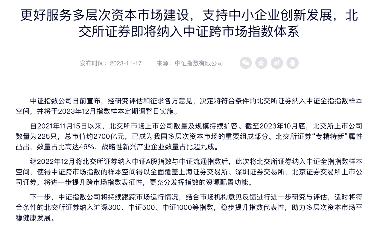 这意味着,大家熟悉的沪深300、中证500、中证1000、中证2000等指数里,未来除了会包括上交所、深交所的上市公司股票,还会包括北交所的上市公司股票。
