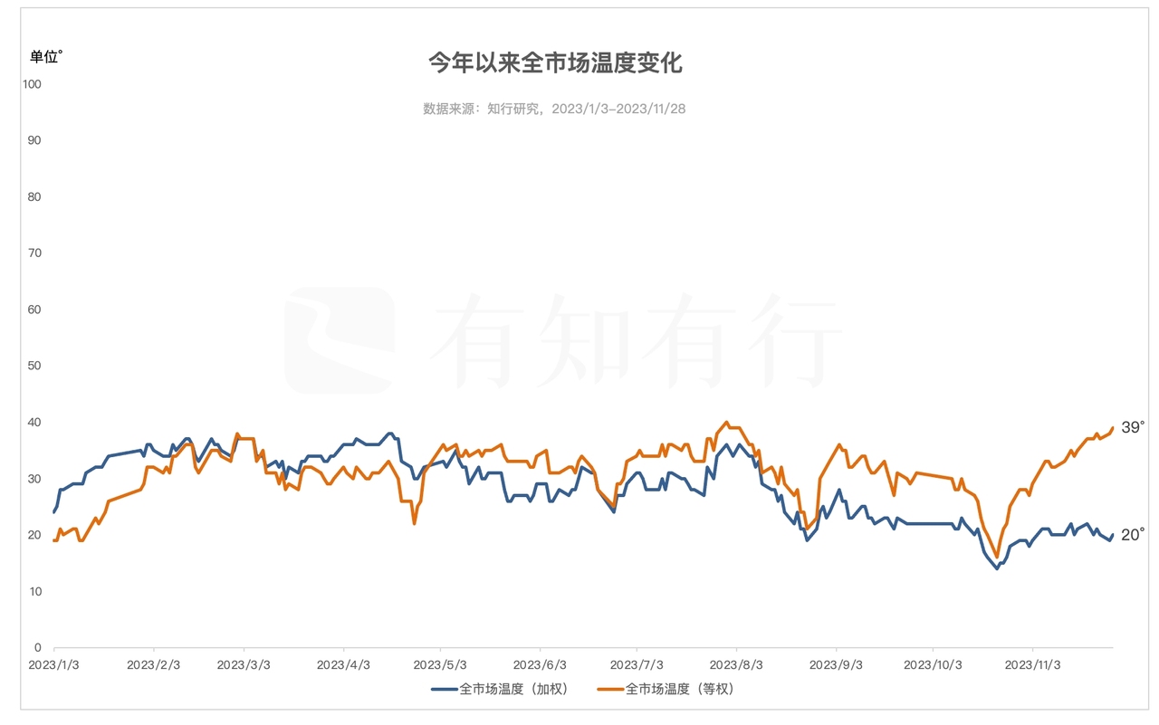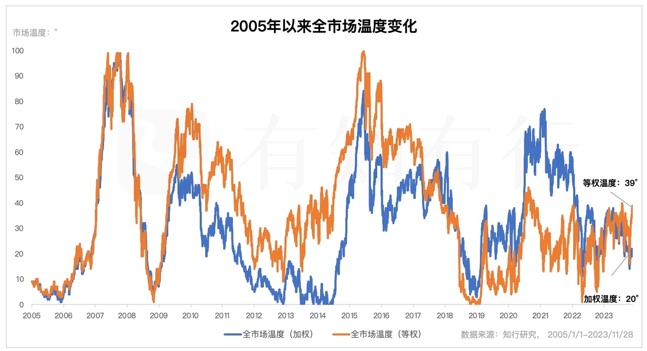 如果我们拉长周期来看两种方式计算的全市场温度的变化情况,会发现二者在过往A股中,很多时间的表现是一致的,尤其是全面牛市、全面熊市来临的时候,不论是等权温度、加权温度,大家的变化方向是一致的,只不过等权温度由于对每只个股的权重是一样的,所以整体更偏向于小盘股,温度变化的弹性更大一些。