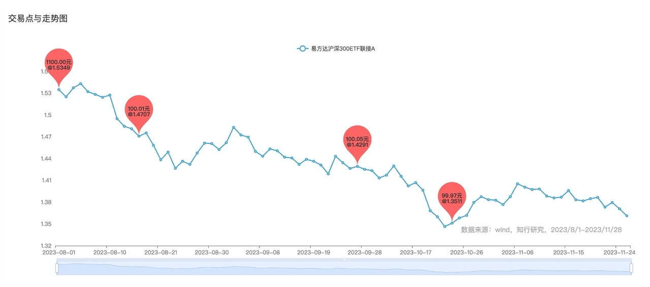 说回来,上图展示了如果你在今年 8 月 1 日买入长钱账户 1 万元后,长钱账户让你分批买入沪深300基金的情况。8 月 1 日会将你 1 万元里的 1100 元买入沪深300基金,占比 11%,买入价格是 1.5349。之后随着沪深300基金下跌,长钱账户让你分批买入,慢慢摊低成本,相比于 8 月 1 日一次性买入,这种方式可以控制账户下跌幅度。