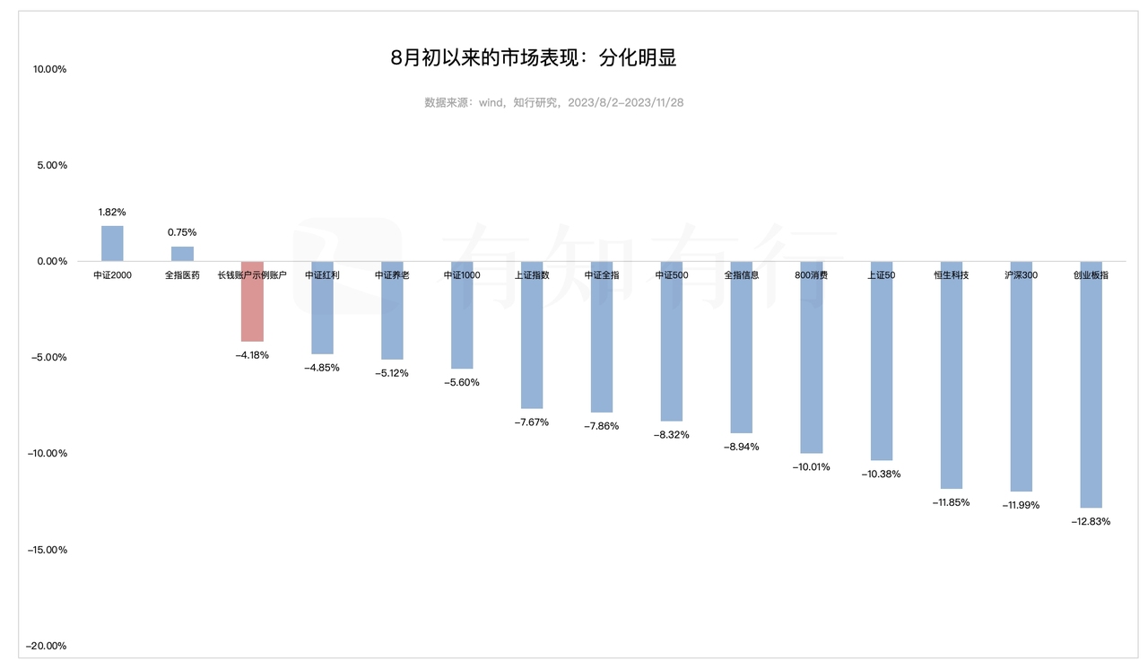 就如下图展示的那样,股市表现不佳时,长钱账户让大家浮亏小一点、体验好一点,也算是在市场环境不好时给大家提供一丝丝慰藉,好让大家能坚持长期投资,有机会享受到市场上涨的收益。