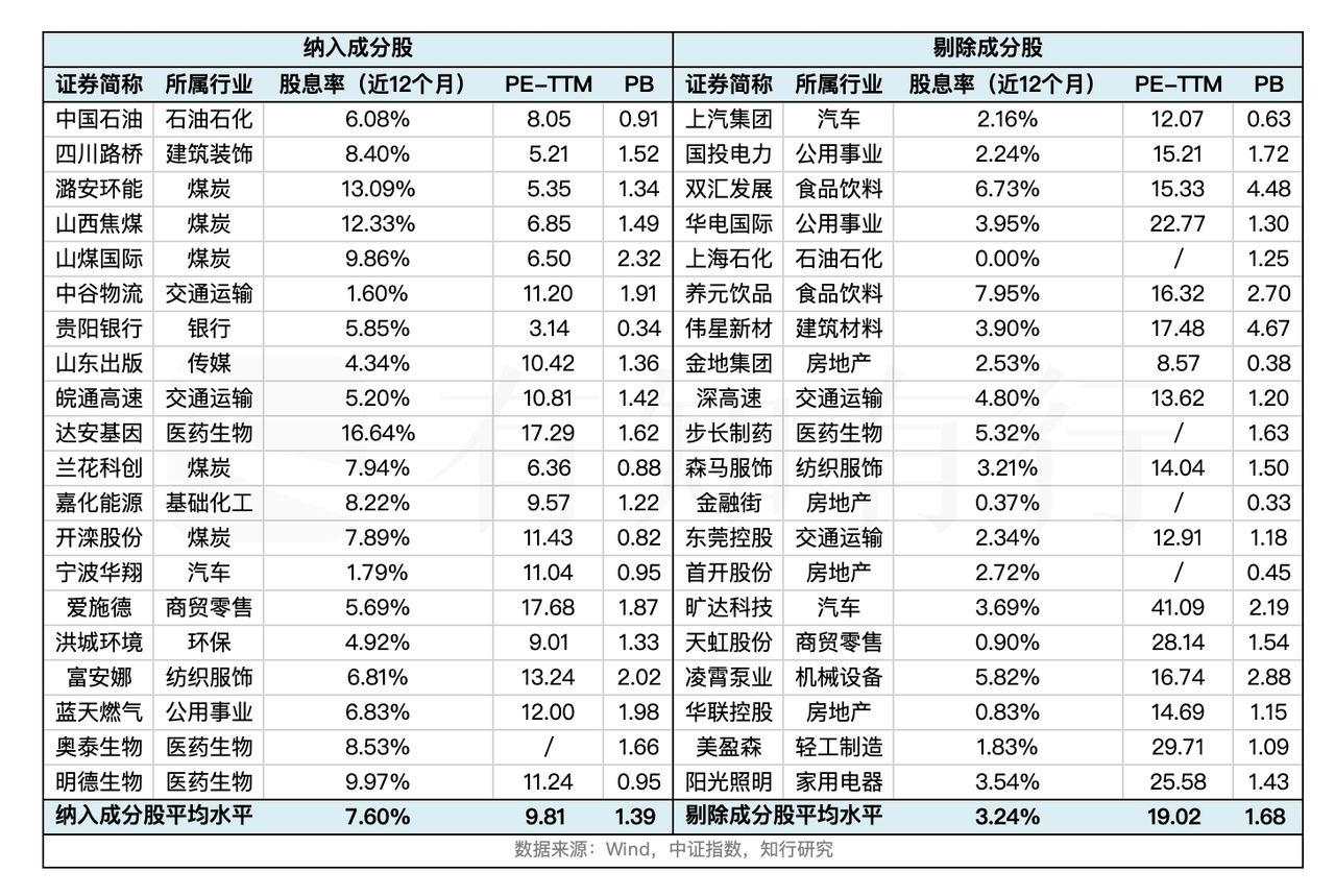 我们来看一下这次中证红利调整成份股的情况,上图展示了纳入成份股与剔除成份股的名单,以及对应的股息率PEPB 数据。由于中证没有公布具体名单在指数里的权重分配,我们看一下平均水平就好。从平均水平来看,纳入成份股最近 12 个月的股息率是 7.6%,剔除成份股仅有 3.24%,纳入成份股的股息率确实更高。从估值数据来看,纳入成份股不论是 PE 还是 PB,整体会更低一些。