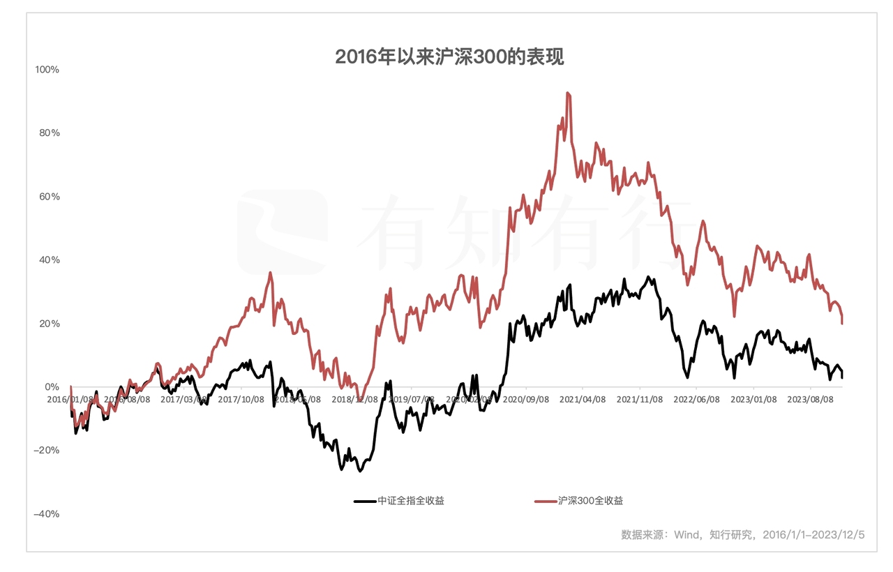 上面这张图展示了沪深300和中证全指从 2016 年以来的涨跌情况,为了跟我们投资的指数基金的表现更一致,这里的指数都用到了包含股息再投资收益的全收益指数。