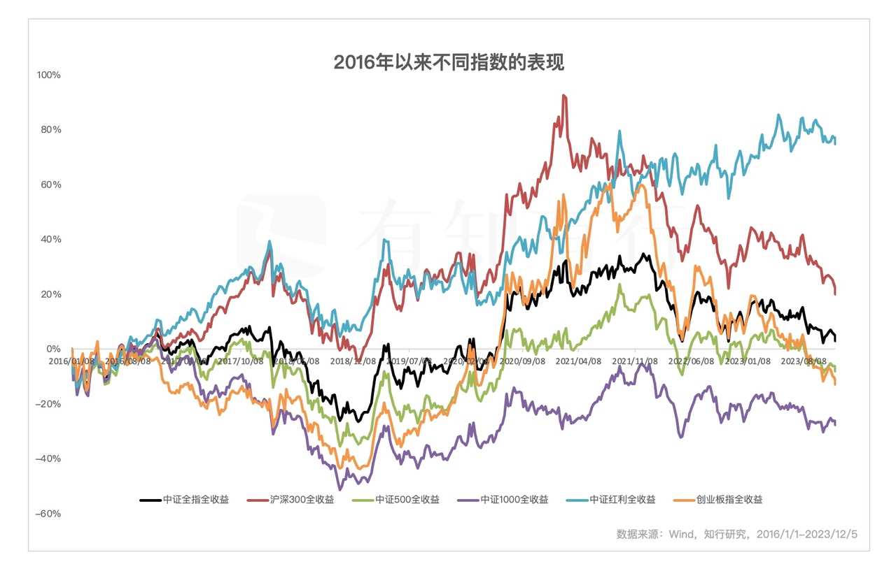 从图里能明显看出来,2016 年年初到 2021 年年初,沪深300相比于其他指数来说,表现都很好。这个阶段表现最差的是中证500、中证1000等中小盘指数,持有五年,没赚到钱,整体表现比中证全指还差。如果有人在那个阶段重仓中证500,持有体验就会很差。
