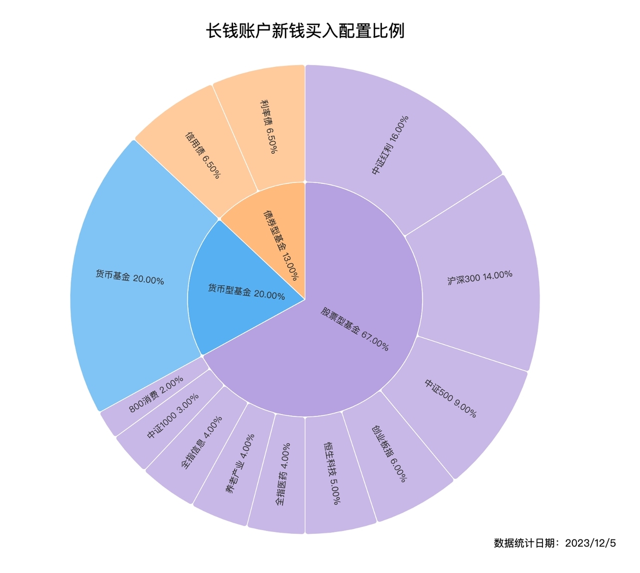 目前如果你有一笔新钱买入长钱账户,会帮你配置 67% 的股票型基金,其余都是债券型基金和货币型基金。股票型基金里,搭配了不同特点的宽基指数和行业主题指数进行分散,具体品种和比例见上图。