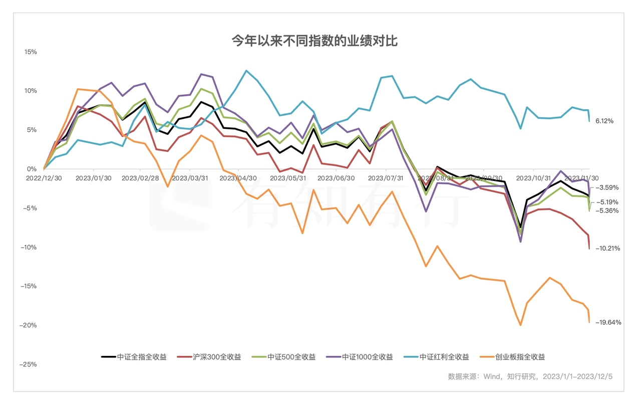 如果你的基金持仓偏向于上面某一种风格或类别,那么今年的投资感受会千差万别。对于重仓中证红利以及价值风格基金的投资者来,今年投资收益还不错。对于重仓中证500、中证1000的投资者来说,今年的市场有点无趣。对于重仓沪深300或者创业板指的投资者来说,今年说是一个熊市,也是合情合理的,毕竟创业板指都跌了 20% 了。